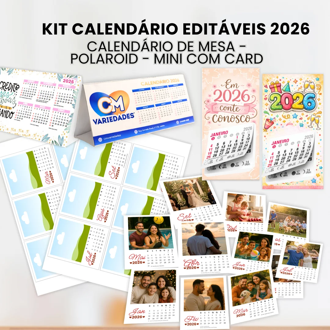 Kit completo com calendários 2026 prontos para editar ou imprimir. Inclui modelos de mesa, estilo Polaroid e mini com card.